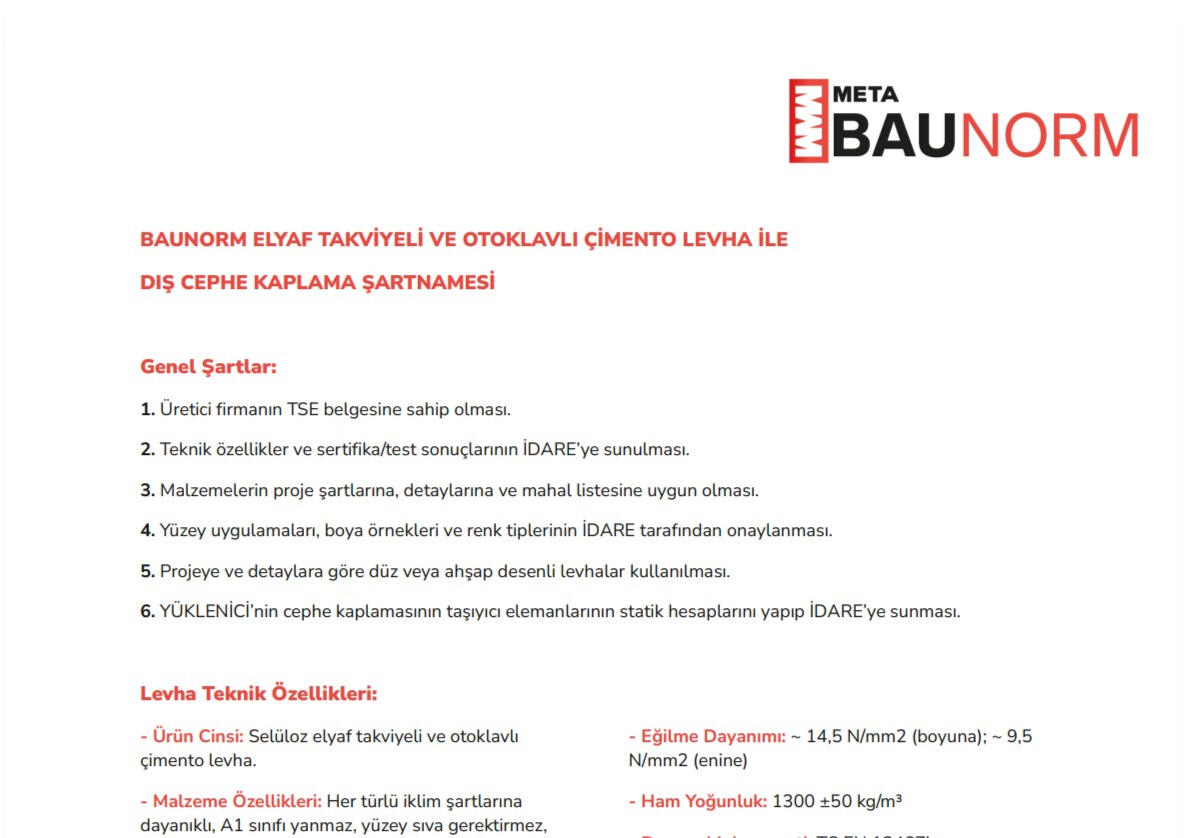 BAUNORM, ileri Hatschek teknolojisi ile üretilen ve otoklav işlemine tabi tutulan lifli çimento levhalarıyla, yapı ve endüstri sektörüne yüksek performanslı, uzun ömürlü ve çevre dostu çözümler sunmaktadır. Bu levhalar, dayanıklılık ve hafiflik özelliklerinin yanı sıra yangına dayanıklılık, neme karşı direnç ve estetik çeşitliliği ile sektörde öne çıkmaktadır.BAUNORM ürünleri, konut projelerinden endüstriyel yapılara kadar geniş bir kullanım alanına sahiptir. Meta Endüstri A.Ş.'nin sürdürülebilirlik odaklı üretim anlayışı sayesinde, ürünler yalnızca sektörel ihtiyaçları karşılamakla kalmaz, aynı zamanda çevresel sorumlulukları da gözetir.Yenilikçi üretim süreçleri ve sektörel uzmanlığıyla Meta Endüstri A.Ş., BAUNORM markasıyla müşteri beklentilerini aşan çözümler sunmaya ve yapı sektöründe güvenilir bir iş ortağı olmaya devam etmektedir.